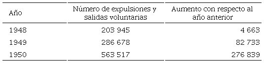 Desde el inicio del año de 1949, cuando se renegociaban los acuerdos braceriles entre ambos gobiernos, la CTM apoyó la postura del gobierno de México al efecto de que se mantuviera la contratación bilateral y que se efectuara primordialmente por medio de la regularización del estatus de los migrantes indocumentados que se encontraban en Estados Unidos.62 Esta estrategia no logró su propósito (frenar la corriente migratoria desde el centro del país hacia el norte) y la corriente migratoria indocumentada se incrementó entre 1948 y 1950, como se puede observar en la tabla.