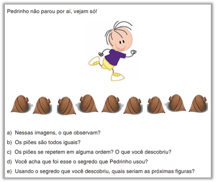 No que respeita ao desenvolvimento da percepção de regularidades, Santos, Luvison e Moreira (2018) propõem tarefas com sequências, em que o objetivo deve ser a identificação do “segredo/motivo” pelo estudante. Tais tarefas devem levar em conta as vivências anteriores das crianças e, por isso, é importante a discussão dos diferentes modos de resolução que possivelmente serão apresentados. As sequências podem ser construídas de diferentes formas: com cores, imagens, desenhos, entre outras opções que o professor que ensina Matemática considerar mais pertinente como, por exemplo, tampas de garrafas ou o próprio corpo para que os estudantes tenham a possibilidade de criação e, não apenas, resolver. Especificamente acerca do ciclo da alfabetização, podemos citar o exemplo apresentado pelos autores: