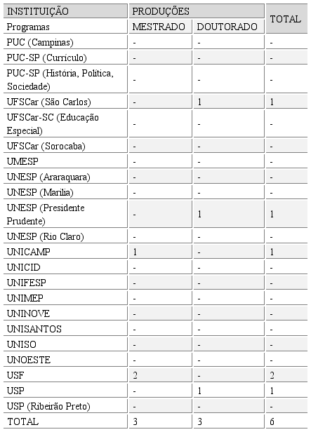 Ao todo, foram encontrados 3 mestrados, destes 1 da UNICAMP; e 2 (dois) na USF. Ainda foram localizados 3 (três) doutorados, assim distribuídos: UFSCar, campus São Carlos (1); UNESP, campus Presidente Prudente (1); e USP (1).