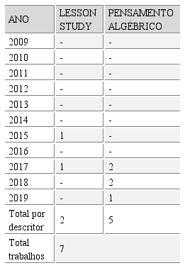Logo, dada a baixa proporção em termos de pesquisas em ambos descritores que adotamos e a não existência, no período e região mapeados, de trabalhos que correlacionem Lesson Study com processos de desenvolvimento do pensamento algébrico, entendemos ser esta uma possibilidade rica e promissora a ser explorada com professores dos Anos Iniciais nas ações de formação continuada, o que perspectivamos ocorrer na trajetória de pesquisa e nas ações que nosso grupo de estudos já vem realizando na região de São Carlos, desde março de 2019.
