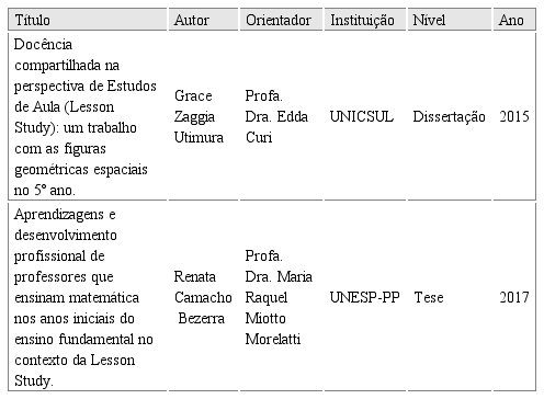 UTIMURA, Grace Zaggia. Docência compartilhada na perspectiva de Estudos de Aula (Lesson Sutdy): um trabalho com as figuras geométricas espaciais no 5º ano. 2015. 161f. Dissertação (Mestrado em Ensino de Ciências e Matemática) — Universidade Cruzeiro do Sul. São Paulo.