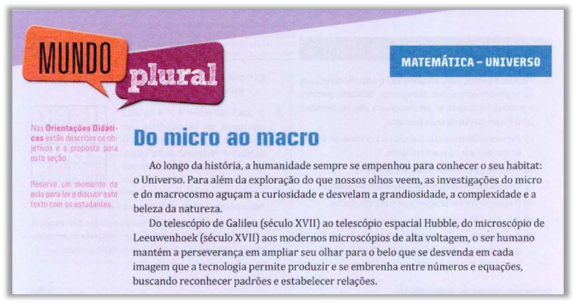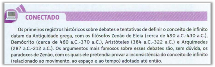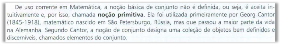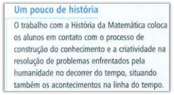 Durante a introdução deste trabalho apresentamos duas enunciações acerca do que estamos entendemos ser uma valorização da Matemática, durante a virada do século XIX para o século XX. Ao analisar a História dos conjuntos, contida nos livros didáticos aprovados pelo PNLD 2018 foi possível constatar algumas enunciações relacionados também à valorização da Matemática. Vejamos as mesmas a seguir, ilustradas nas Figuras de 1 a 6.