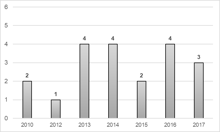 A análise inicial dos 20 textos mostra a distribuição de teses e dissertações de acordo com o ano de publicação de cada um desses textos, conforme se pode observar no Gráfico 1. Percebe-se, assim, que ao longo do período investigado (2008 a 2017), em quase todos os anos houve um ou mais trabalhos que tinham como foco formações de professores que ensinam Matemática em contextos de Comunidades de Prática no modelo presencial.