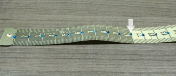 Salientamos que preparamos essa fita pensando que o aluno deficiente visual a solicitaria. Para produzi-la, fizemos uma adaptação, colocando cola de relevo (hipoalérgica) sobre a fita métrica para representar a medida em centímetros de um ponto a outro como está indicado na Figura 2.
