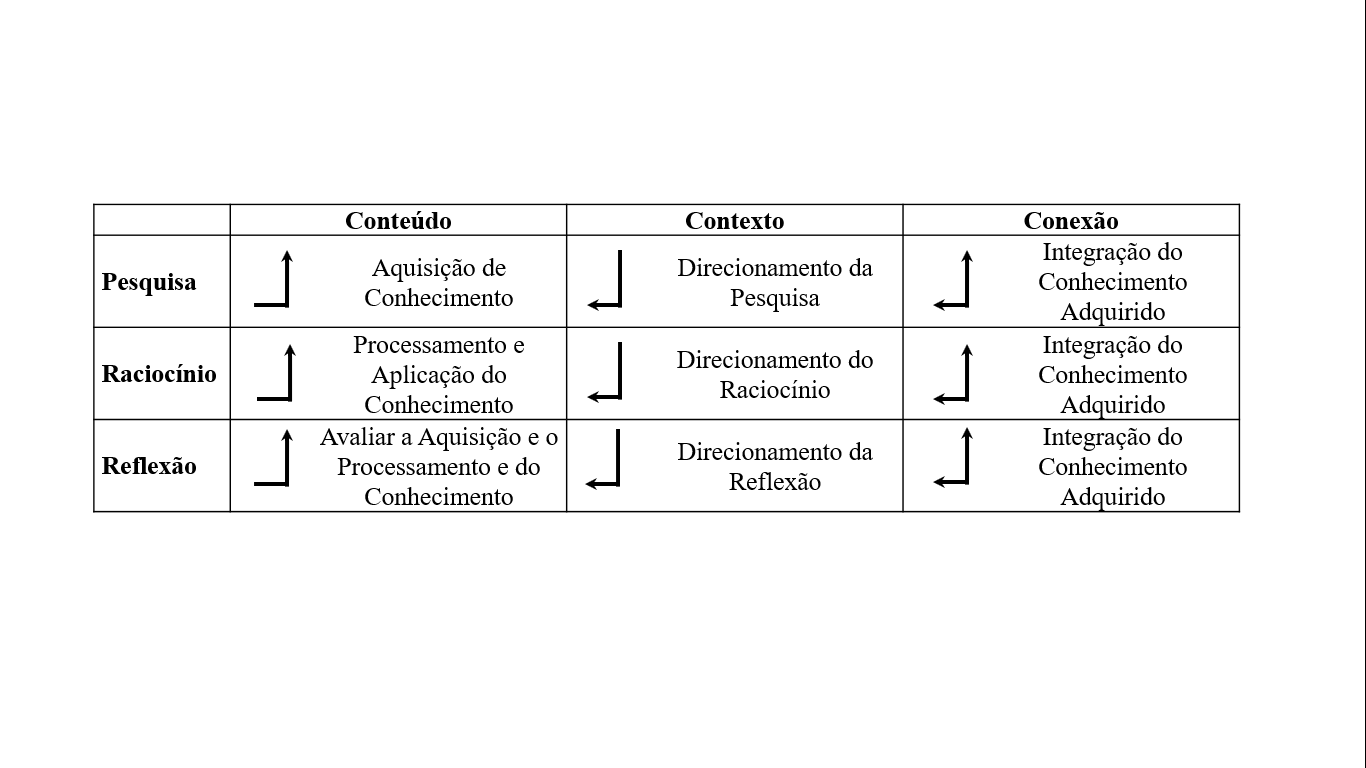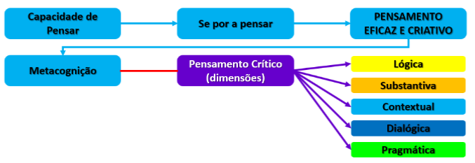 Villarini Jusino (2003) propôs um modelo para entendimento e análise do pensamento crítico no qual o crescimento, eficácia e criatividade do pensamento repousam em sua capacidade contínua de autoexame, autocrítica e autocontrole que proporcionam a capacidade crítica ao indivíduo, no caso, os estudantes, a partir de metacognição (Figura 2). Essa argumentação por sua vez também se assemelha ao entendimento de Lipman (1988) bem como os pensamentos preconizados por Guzzo e Lima (2018), Siegel (1988) e Skovsmose (2008) sobre pensamento crítico.