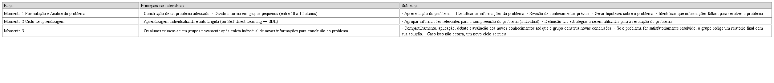 § Passo 1. Criar metas e objetivos — criadas metas norteadoras e objetivos de aprendizado. Devem ser traçados tanto os objetivos quanto objetivos que desenvolvam às habilidades de resolução de problemas e estudo autodirigido (Self-direct Learning — SDL).