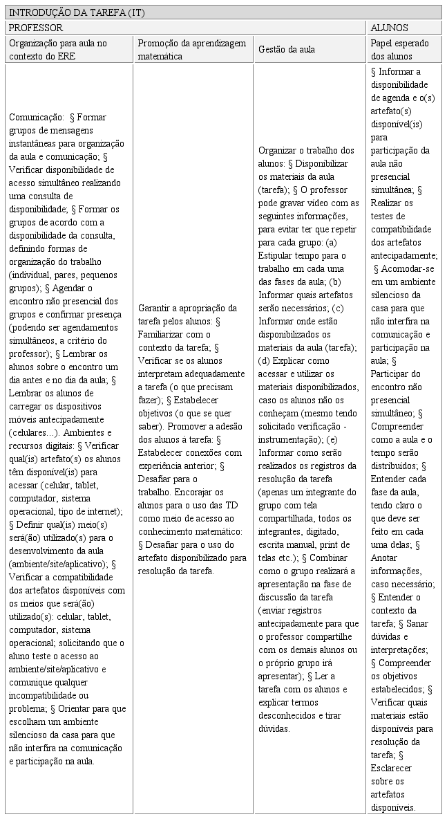 i) Introdução da tarefa: é o momento em que o professor explica como será o desenvolvimento da aula, a organização dos grupos, a forma como a tarefa será desenvolvida, e o que acontecerá em cada fase seguinte. Além disso, o professor estabelecerá o tempo de realização para cada uma das fases de desenvolvimento e socialização da tarefa com a turma, quais os recursos disponíveis para auxiliar na resolução da tarefa, as formas de registro e como serão avaliados. Nesta fase, o professor faz a leitura da tarefa com os alunos, esclarecendo interpretações e/ou dúvidas, de forma que os alunos compreendam claramente aquilo que precisam fazer e se apropriem da tarefa, estabelecendo objetivos, e procurando engajar os alunos para a resolução da tarefa.