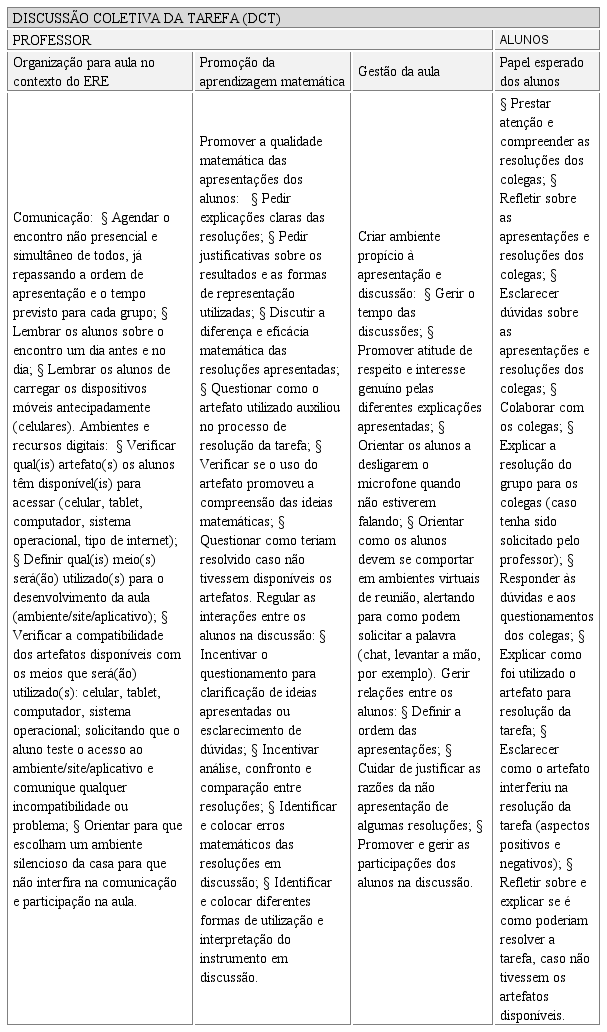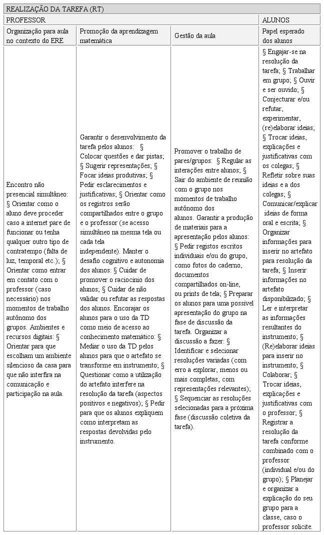 Quanto à organização para aula no contexto ERE, incluímos a forma de registro, esclarecendo como deverão ser efetuados os registros da sistematização do conteúdo, se devem registrar no caderno, ou utilizar editor de texto etc., além da forma de envio desses registros para o professor — enviar foto por e-mail, Google Sala de aula ou compartilhar documento etc. Na nossa experiência, percebemos que alguns grupos tiveram mais facilidade em trabalhar com documentos on-line em que os componentes dos grupos registravam as ideias/respostas ao mesmo tempo. Um grupo preferiu o registro escrito no caderno, compartilhando as fotos das resoluções do grupo e depois escolhiam um dos registros para apresentar na fase de discussão coletiva da tarefa.