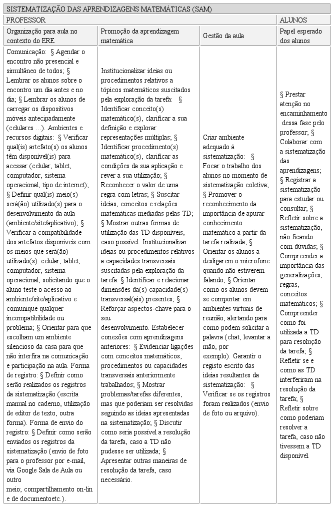 § Para a fase de sistematização das aprendizagens matemáticas no ensino presencial, o professor pode utilizar o quadro para escrever sobre as apresentações de slides ou material utilizado para esta fase. No ERE é necessário que o professor, dependendo dos registros e explicações que deseja fazer, disponha de mesa digitalizadora para registrar ideias e interagir com os alunos.