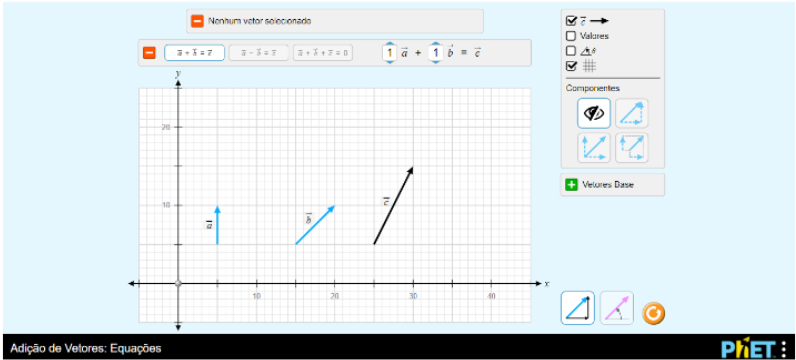 Etapa 3: Em seguida, aconteceu a demonstração do simulador que apresentou as Adições de Vetores: equações a partir da plataforma PhET. O objetivo foi demonstrar a adição e a subtração de vetores, relacionando-as com a Lei dos Senos e a Lei dos Cossenos. Nesta etapa, então, foram utilizados os mesmos exemplos teóricos trabalhados, de modo a permitir que fossem aplicados no simulador.
