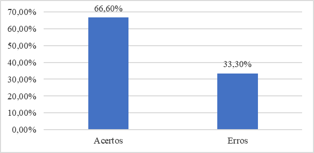 A primeira questão da atividade avaliativa consiste em um item que apresenta essa contextualização: “Bárbara quer fazer a moldura de um quadro para colocar sua pintura no formato de um triângulo. Sabe-se que os vetores de comprimento medem respectivamente = 6 cm e = 4 cm, formando entre si um ângulo de 33,7º. Encontre a medida do terceiro lado que forma essa moldura (Utilize duas ordens decimais)”. Assim, na resolução, por meio do cálculo utilizando a Lei dos Cossenos, teve como objetivo encontrar o valor da medida do terceiro lado igual a, aproximadamente, 7,17 cm. Diante do que é exposto na Figura 2, cerca de 66,6% dos estudantes acertaram o item, apresentando o cálculo de forma satisfatória.