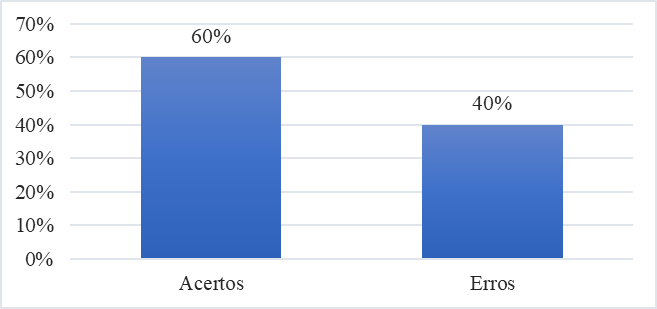 Os resultados dessa pesquisa-ação são apresentados a seguir de duas formas: por meio de gráficos que mostram os índices de erros e de acertos dos estudantes por meio da atividade avaliativa e, em seguida, num único gráfico que apresenta o questionário de autoavaliação dos estudantes em relação aos processos de ensino e de aprendizagem propostos.