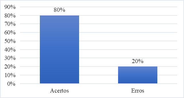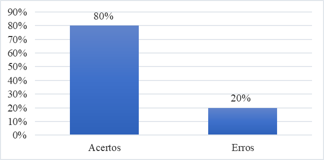 A questão quatro da atividade avaliativa foi assim contextualizada: “João deseja fazer um jardim em sua casa no formato de um triângulo, contendo as medidas de seus vetores de comprimentos iguais a 6 cm e 8 cm, respectivamente, formando entre eles um ângulo de 53,1º. Calcule a medida do terceiro lado”. Assim, a resolução propiciou um cálculo utilizando a Lei dos Senos, de forma que o resultado fosse 10,2 cm para o terceiro lado do triângulo. A Figura 5 mostra que 80% dos estudantes acertaram o item.