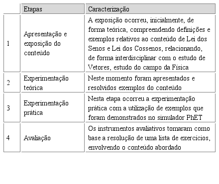 Etapa 1: Ocorreu a exposição do conteúdo relativo à Lei dos Senos e à Lei dos Cossenos, utilizando exemplos relacionados, de forma interdisciplinar, com o conteúdo de Vetores, geralmente, trabalhado em Física, sem se estabelecer correlações com a Matemática.