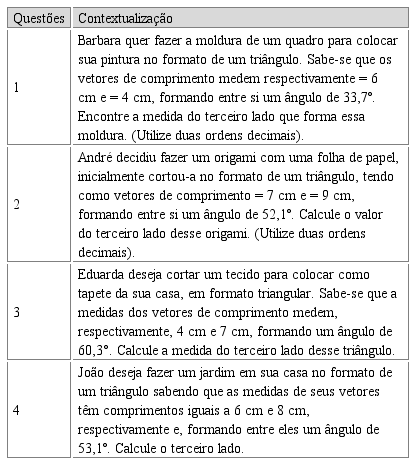 Etapa 4: Os estudantes foram convidados a resolver quatro questões abertas sobre a Lei dos Senos e a Lei dos Cossenos, utilizando para isso as operações com Vetores. No Quadro 2 é possível visualizar as questões propostas como a atividade avaliativa.