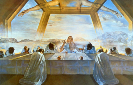 A Razão Áurea está presente nas dimensões e propriedades de simetria de alguns sólidos platônicos que podem ser inscritos em uma esfera. Destes sólidos, vamos fazer referência ao dodecaedro regular, cuja área total de sua superfície é igual a e cujo volume é igual a . Na Figura 10, vimos a obra O Sacramento da Última Ceia, de Salvador Dalí, e nela um enorme dodecaedro regular, inscrito numa esfera que cobre a mesa, que é um retângulo sobre o círculo do equador dessa esfera. Será esse um Retângulo Áureo? Não sabemos se Dalí tinha a intenção de usar nessa obra a Razão Áurea, mas nela há a introdução do dodecaedro regular que, como vimos, tem relação com essa razão, e que ele era estudioso do Renascimento, principalmente, das obras de Da Vinci. As medidas desse quadro são 166,7cm por 267 cm, e , que é próximo de.