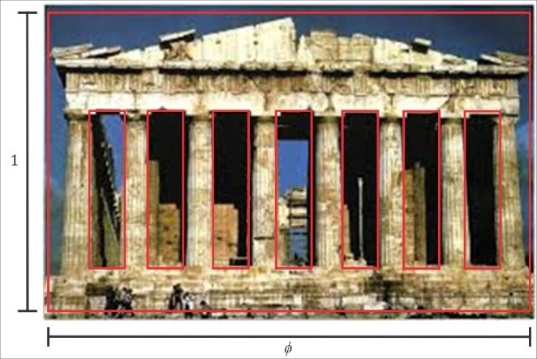 Podemos observar que, possivelmente, ela está presente na construção do Parthenon (Século V, a. C.), na sua fachada, pois a razão entre a altura e a largura é muito próximo de . Dizemos, possivelmente, mesmo depois de se notar a preocupação dos arquitetos da antiguidade em construir obras com proporções harmônicas, porque não há evidências de que ele tenha sido construído usando-se a Razão Áurea, já que foi construído antes da criação dessa razão por Euclides ( 300 a.C.). Na Figura 4, podemos ver alguns retângulos na fachada do Parthenon; medindo-se o maior e menor dos lados desses retângulos e dividindo-os, obtém-se algo bem próximo de 1,618, valor aproximado de .