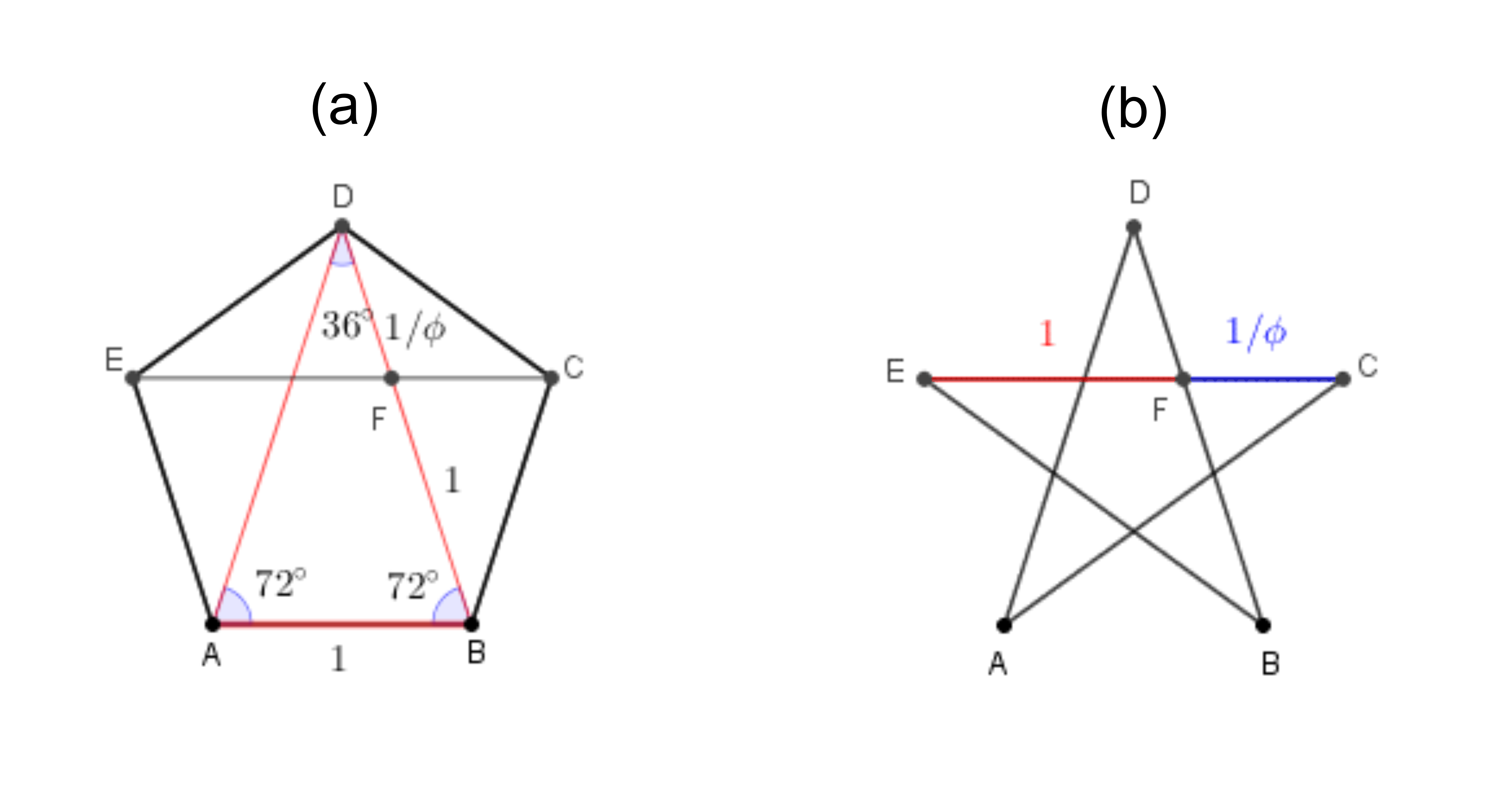 Vamos apresentar outras obras de arte em que aparecem a Razão Áurea, por meio do pentagrama, do Triângulo Áureo, e do dodecaedro regular, um sólido de Platão. Na Figura 7a, temos um pentágono regular cujos lados medem 1 unidade, e sua diagonal , ou seja,. Duas das diagonais de um pentágono regular interceptam-se em um ponto que as dividem na Razão Áurea:. Isto mostra a capacidade de se construir um segmento dividido em sua Razão Áurea, e nos dá ao mesmo tempo uma maneira de se construir um pentágono regular.