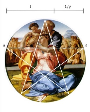 A simetria, harmonizada pelas proporções do pentagrama também nos permite detectar a presença da Razão Áurea em A Família Sagrada(Figura 8), de Michelangelo. Nela, a figura de Maria está no centro do pentagrama, também fazendo a simetria dessa obra, e o ombro de José medindo , com o ponto C, de secção do segmento, no antebraço de José. Uma inspeção com mais detalhes da Figura 8, mostra que outras relações envolvendo essa obra e o número podem ser encontradas.