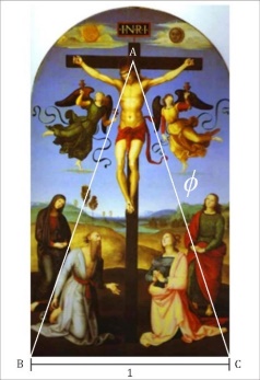Na Figura 9, novamente o Triângulo Áureo, agora na obra de Rafael Sanzio, outro pintor renascentista italiano, intitulada A Crucificação de Cristo com a Virgem Maria, Santos e Anjos. Nesse quadro, há um triângulo isósceles, cuja base mede 1 unidade e os outros dois lados medem, cada um. Observemos que há uma simetria: Cristo Crucificado é o eixo de simetria, ladeado por anjos dispostos simetricamente em relação ao Cristo, como se estivesse observando os santos a partir do vértice , também dispostos de forma simétrica, um em cada um dos vértices e da base desse triângulo, que é áureo. Na Figura 7b, temos um pentagrama, considerado símbolo da Escola Pitagórica, e inspiração de Euclides para a criação da Razão Áurea. Nesse pentagrama, tem-se .