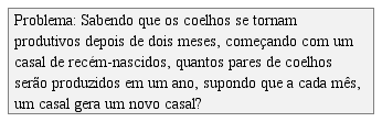 Leonardo Fibonacci, também conhecido como Leonardo de Pisa ou Leonardo Pisano, foi um dos maiores e mais talentosos matemáticos da Idade Média, nascido em 1175, na cidade de Pisa, um importante centro comercial daquela época. Filho de um homem de negócios e funcionário de governo conhecido como Guglielmo, Leonardo era movido a desenvolver e solucionar problemas matemáticos. O problema dos coelhos, um dos mais conhecidos de Fibonacci, foi proposto em seu Liber Abaci de 1202, como “Quot paria coniculorum in uno anno ex uno pario germinentur” (HEFEZ, 2006, p. 26). Em uma linguagem moderna, este problema fica conforme o Quadro 1.