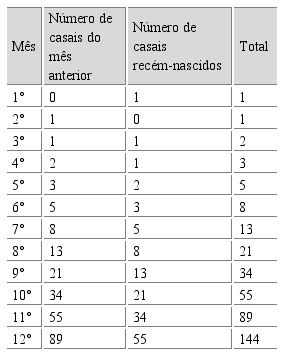 Nos dois primeiros meses haverá apenas 1 casal, pois ainda não reproduziram, isto é, no final do segundo mês, o casal do mês anterior (recém-nascido) se tornou adulto. A partir do terceiro mês, que começa com 2 casais (1 adulto e 1 recém-nascido), cada casal produzirá mais um casal, chegando-se a 3 casais no quarto mês (2 adultos — sendo 1 casal adulto do mês anterior, mais o recém-nascido do mês anterior que se tornou adulto neste mês — mais 1 reproduzido pelo casal adulto do mês anterior). Continuando assim, no quinto mês, teremos 5 casais, sendo 3 adultos e 2 recém-nascidos, de acordo com a análise anterior, 8 casais no sexto mês, e assim por diante, até chegarmos a 144 casais no 12° mês. Na Tabela 1, encontra-se a solução de Fibonacci, que mostra a população de coelhos em cada mês.