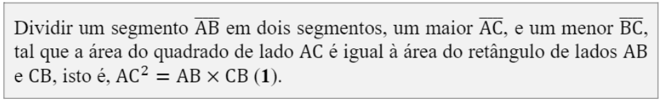 “divisão de um segmento em média e extrema razão”, como a divisão de um segmento em duas partes desiguais com uma propriedade bem particular: o quociente entre o segmento inteiro e a parte maior é igual ao quociente do segmento maior pelo segmento menor (BELINI, 2015, p. 16).