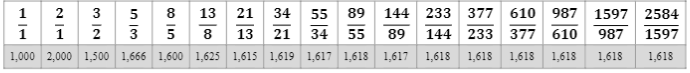 Observemos que, à medida que o número de termos da sequência cresce, o quociente entre um termo qualquer dessa sequência e o anterior se aproxima de , alternando um maior e um menor, e a partir do 12º termo, o algarismo da terceira ordem decimal é sempre 8. Ávila (1985) foi mais além, mostrando que a Sequência de Fibonacci e a Razão Áurea se relacionam da seguinte maneira: