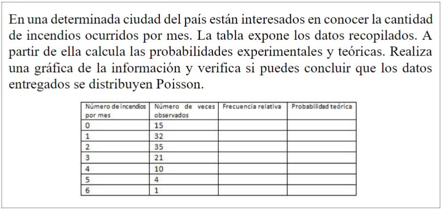 Para finalizar, se pide a los estudiantes que analicen un conjunto de datos y que determinen si la situación analizada corresponde o no a una distribución de Poisson. La clase se cierra definiendo formalmente el concepto de distribución de Poisson, que se corresponde a una distribución de probabilidad de variable discreta, cuyo parámetro λ siempre es positivo.