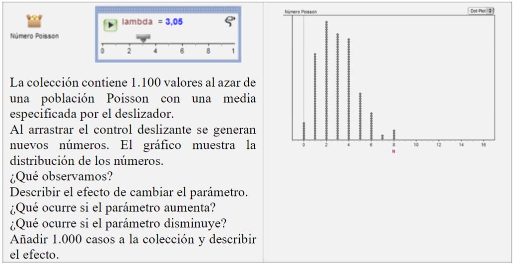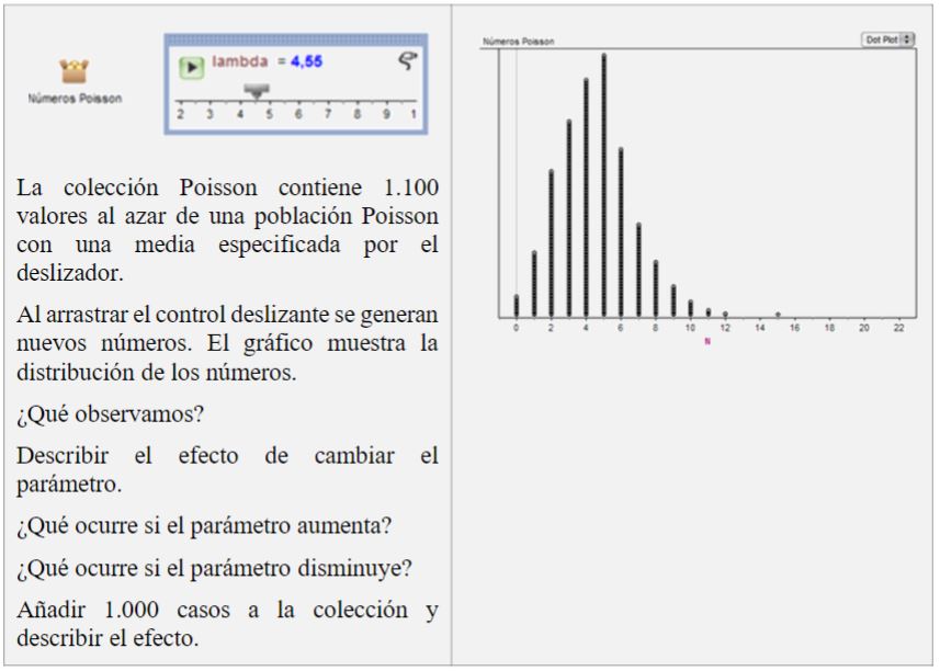 En este momento, la investigadora principal, para guiar las ideas de los estudiantes, propuso preguntas como: ¿Qué observas en la gráfica?; ¿Podrías describir cómo cambia el parámetro lambda (media de la distribución)?; ¿Qué ocurre cuando el parámetro aumenta?; ¿Qué ocurre cuando el parámetro disminuye? Algunos estudiantes compartieron con el resto de la clase sus observaciones y conjeturas.