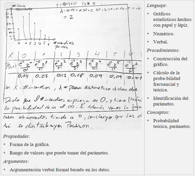 En la Figura 4 se presenta una respuesta del ítem 2 y su análisis se sustenta en la configuración numérica-algebraica (Cuadro 1), la que considera los diferentes objetos matemáticos que intervienen en la resolución de dicha situación-problema. En la producción se observa que se calcula el parámetro (media muestral) para luego reemplazarlo en la Probabilidad teórica. Uno de los argumentos verbales importantes que presenta el estudiante es la característica del parámetro, que comienza en cero, es decir, pueden ocurrir cero incendios, y teóricamente podrían ocurrir infinitos incendios también. La información la relaciona para inferir que la muestra corresponde a una distribución de Poisson. Se aprecian algunas debilidades en la construcción de la representación gráfica, como la falta de proporción en los valores de los ejes, lo que podría deberse a un desconocimiento, o la falta de espacio suficiente para realizar una mejor construcción.