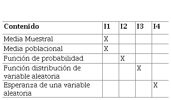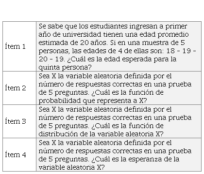 Las preguntas fueron seleccionadas por un equipo compuesto de tres doctores en Estadística, con vasta expertiz en docencia universitaria. Se consideró su experiencia en cursos anteriores y el programa de la asignatura. El cuestionario se compuso de cuatro ítems, que se presentan en el Anexo, y abordan diversos conceptos como se puede observar en la Tabla 1, entre ellos el de media muestral y poblacional, función probabilidad, junto con el de esperanza. Estas nociones son fundamentales para la comprensión de la distribución de Poisson (ARROYO et al., 2014).