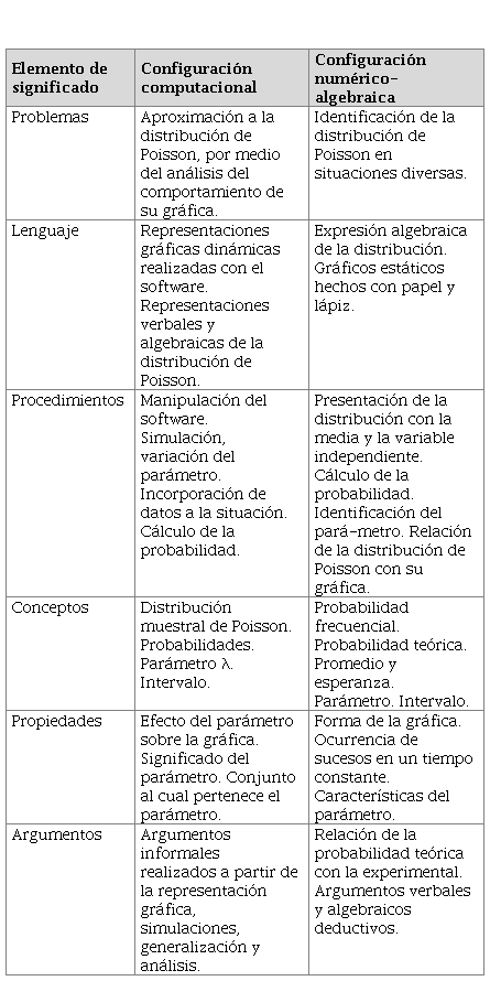 En el Cuadro 1 se observan los diferentes objetos que participan en cada configuración, dependiendo si se trata de la computacional o la numérico-algebraica. Por ejemplo, en la configuración numérico-algebraica la situación-problema consiste en reconocer la distribución de Poisson en una situación presentada, mientras que en la computacional requiere aproximarse a este tipo de distribución a partir del estudio de su gráfica. El lenguaje utilizado puede ser gráfico estático o dinámico dependiendo de la configuración. Los conceptos son dados por su definición o descripción como la distribución de Poisson, la probabilidad, o los parámetros. Las proposiciones o propiedades se corresponden a los valores que pueden tomar las probabilidades, o los intervalos de valores para el parámetro. Los procedimientos variarán dependiendo de la configuración, por ejemplo, construir un gráfico será diferente si se realiza con papel y lápiz que con uso de tecnología. Finalmente, los argumentos que permiten asegurar la veracidad de las proposiciones y procedimientos utilizados — deductivos, inductivos, algebraicos etc. — y que también dependerán del tipo de configuración que se trate.