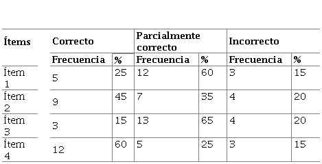 Las respuestas de los estudiantes fueron analizadas por medio de un análisis de contenido (IZCARA, 2016) y se establecieron tres categorías de respuesta para cada ítem: correcta, parciamente correcta e incorrecta. En la Tabla 2 se presenta un resumen de los resultados.