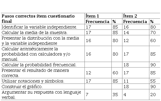 Respecto a los resultados obtenidos en el cuestionario final, en la Tabla 3 se presenta lo relativo a los diferentes procedimientos implicados en la resolución de los dos ítems que lo conforman. Apreciamos que la mayor parte de los estudiantes determina de manera correcta la media de la muestra tanto en el ítem 1 (85%) como en el 2 (70%), lo que se conforma en el primer paso para calcular las probabilidades usando la distribución de Poisson, procedimiento que también fue realizado por la mayor parte de los estudiantes (ítem 1, 80%; ítem 2, 60%). En ambos ítems un alto porcentaje resuelve satisfactoriamente siendo más elevado en el ítem 2 (85%) que en el 1 (60%). Respecto a presentar la distribución de Poisson, señalando de manera correcta tanto la media como la variable independiente, gran parte de los estudiantes lo desarrolla correctamente en el ítem 1 (80%) y en menor medida en el 2 (60%). El ítem 2 consideró otros procedimientos que no fueron contemplados en el ítem 1, y que también fueron desarrollados por la mayoría de los participantes, como calcular la probabilidad desde un enfoque frecuencial (90%) o la construcción de un gráfico (90%).