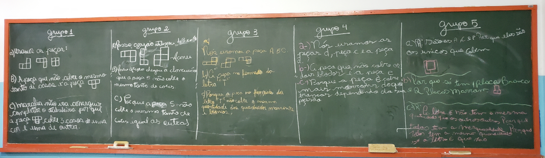 (Dados da Pesquisa)Os demais grupos também foram chegando à conclusão de que a peça no formato de letra T fazia com que o tabuleiro não fosse totalmente completado. Em seguida, um integrante de cada grupo foi até a lousa expor os resultados e explicar como haviam resolvido cada item do problema. A Figura 9 mostra as respectivas soluções.