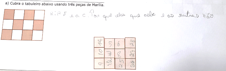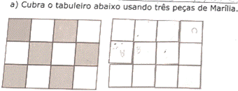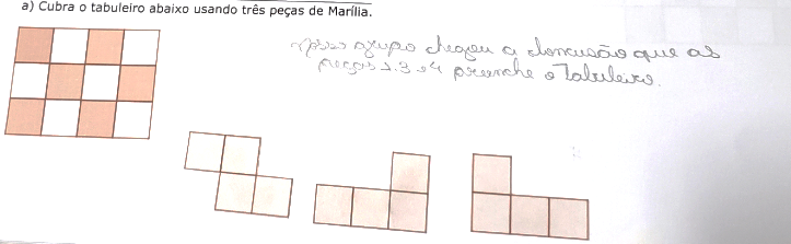 Nos demais grupos, observou-se que também estavam utilizando as peças para tentar completar o tabuleiro. Após um tempo, o grupo 3 disse ao professor que tinha chegado à resposta.