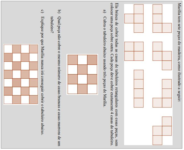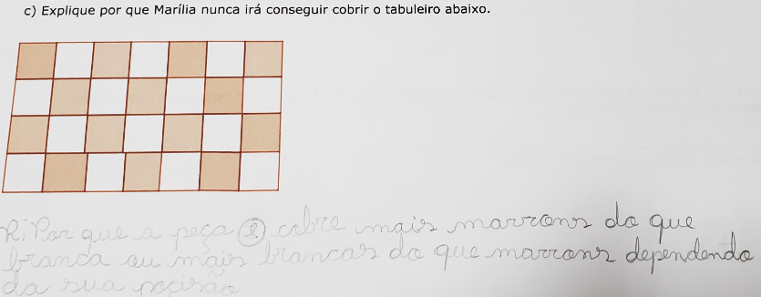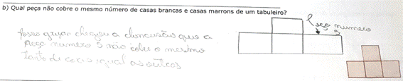 No item b), que continha a pergunta: Qual peça não cobre o mesmo número de casas brancas e casas marrons de um tabuleiro? Em um dos grupos, surgiu dúvida com relação ao que estava sendo solicitado: