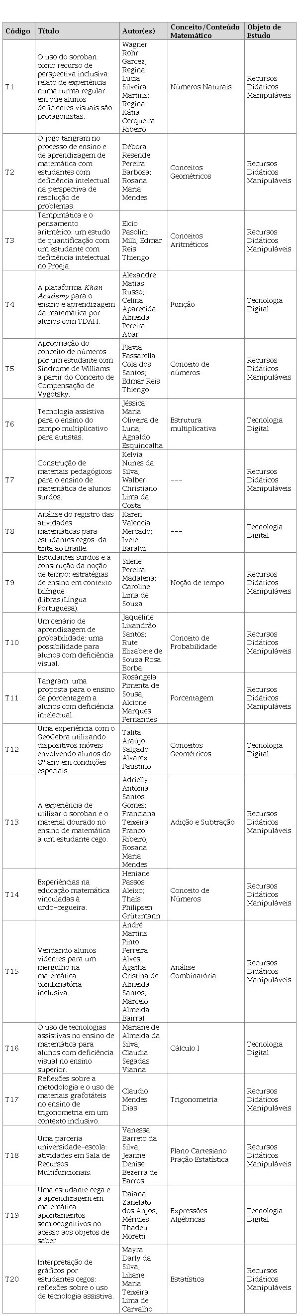 Para determinar o corpus de análise da pesquisa bibliográfica, identificamos, por meio do resumo e das palavras-chave, trabalhos que abordam a temática. Em seguida, verificamos aqueles que não foram possíveis de serem identificados por meio desses dois critérios, passando à leitura na íntegra; ao todo, foram analisados 74 trabalhos. Para a composição do corpus, como critérios de inclusão, elegemos somente os textos que tratavam especificamente de trabalhos empíricos das comunicações científicas no uso das tecnologias digitais e recursos didáticos manipuláveis, na prática pedagógica que se propõe inclusiva. Nesse sentido, os critérios de exclusão permearam os trabalhos que traziam pesquisas apenas teóricas, bibliográficas, as quais se desdobram em síntese de literatura e ensaio teórico. Após definirmos como critérios de exclusão e inclusão, restaram 20 trabalhos que abordam, de forma explícita, a adoção de tecnologias digitais e recursos didáticos manipuláveis na perspectiva inclusiva no ensino de Matemática.