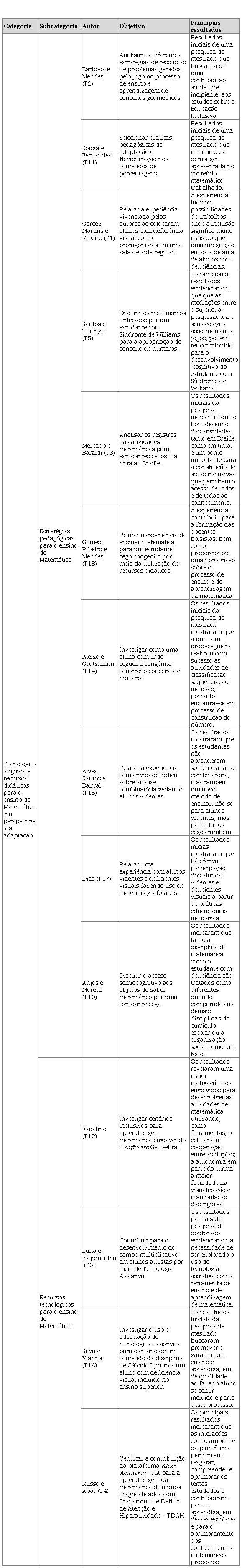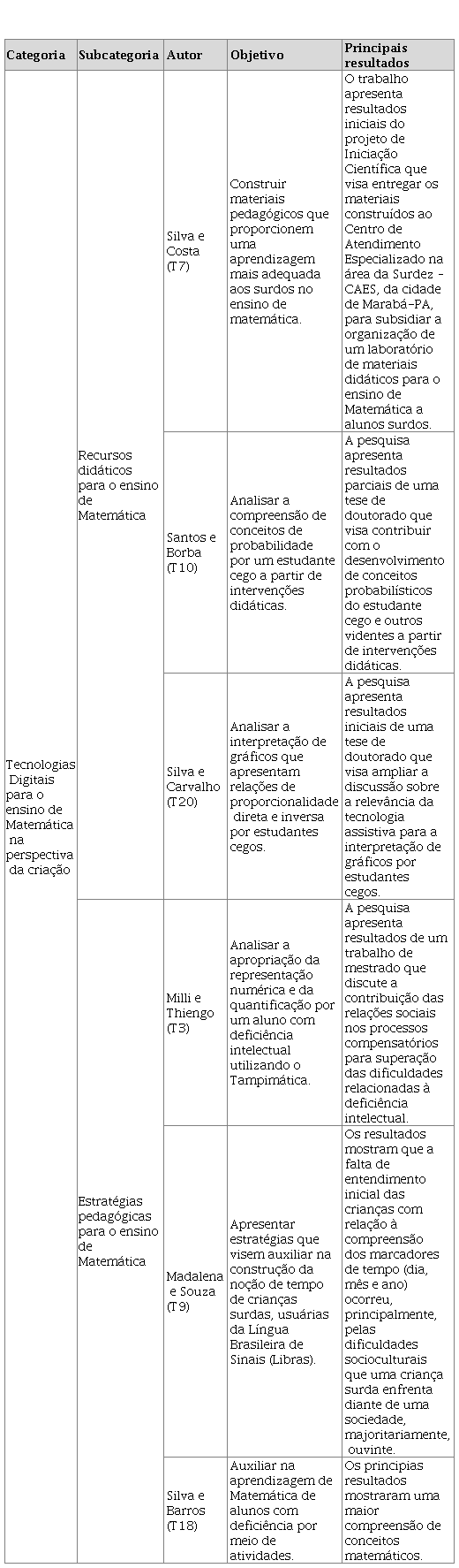 Considerando as pesquisas relacionadas às tecnologias digitais e recursos didáticos manipuláveis na Educação Matemática Inclusiva, indicamos, no Quadro 2, uma síntese dos trabalhos enquadrados nesta categoria, bem como as duas subcategorias temáticas.