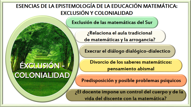 ¿Qué ha pasado en esta historia colonial hasta nuestros días con la Educación Matemática? Responder la pregunta sería dar esencias de la epistemología de la Educación Matemática catalogadas de exclusión y colonialidad. Declaramos que no haremos un recorrido de dicha epistemología en su secuencia; iremos a los puntos más connotativos de la crisis; andaremos a la raíz sin embargo; a los tentáculos del poder biopolítico; como lo denominamos: el des-ligaje de la biopolítica para el re-ligaje en la Educación Matemática Decolonial Transcompleja (RODRIGUEZ, 2020c); que son resultados de la mencionada línea de investigación. Queremos responder la pregunta inicial en este párrafo para luego desmitificar algunos aspectos excluyentes del recorrido epistemológico de la Educación Matemática.