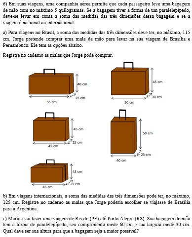 Com a próxima tarefa (Figura 1), buscamos analisar seu enunciado, qual motivo é posto para a criança realizá-la e se sua realizao se apoia meramente em técnicas, ou seja, em como fazer. Verificamos que para abordar o conceito de tridimensionalidade, a criança necessita realizar a medição das malas para o sujeito poder viajar.
