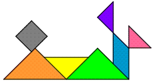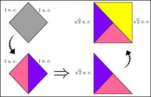 A área da peça Quadrado do tangram é congruente com a área de duas peças Triângulo Pequeno, estas podem ser reorganizadas sob a forma da peça Triângulo Médio sem alteração de sua área. Unindo, então, duas peças Triângulo Pequeno (1 unidade de área) e uma peça Triângulo Médio (1 unidade de área), obtêm-se um quadrado com área igual a 2, isto é, o dobro da área da peça Quadrado. Além disso, o lado do quadrado obtido é congruente ao segmento diagonal da peça Quadrado.