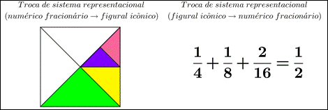 Cada sistema representativo tem regras próprias de funcionamento, sendo desenvolvimento conceitual matemático propiciado pela mobilização sinérgica de, pelo menos, dois sistemas de representação para um mesmo objeto (DUVAL, 2011). Por exemplo, a mobilização da representação fracionária não basta para conceituar o ente número racional, é preciso compreendê-lo em representação numérica decimal e percentual (DAMM, 2006), ainda por meio de figuras (representação icônica), como ponto sobre a reta numérica (representação geométrica) e com a designação/escrita em língua natural.