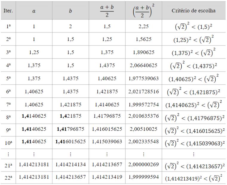 Elaborado pelas AutorasNa Tabela 1, se exemplifica uma aproximação decimal de pelo método da bissecção, na qual o intervalo inicial [1; 2] é definido ao constatar a seguinte desigualdade , que pode ser reescrita como . Na 22ª iteração se constata uma aproximação com precisão de 6 dízimas, e pode-se continuar o processo infinitamente.