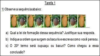 As questões formuladas para orientar as tarefas direcionavam os estudantes a repensar seu olhar sobre o conhecimento matemático. Nesse sentido, os comandos das questões obedeceram a diferentes formatos discursivos: a pergunta e o pedido de justificativa da resposta (Qual a lei de formação dessa sequência? Justifique sua resposta); uma afirmativa ou pergunta e o pedido de justificativa (Indique a ordem que surgem os bacuris e escreva como você pensou. O 20º termo será cupuaçu ou bacuri? Como chegou a essa conclusão?).