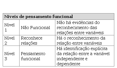 O nível 1 é considerado como não funcional, por não identificar qualquer aspecto do pensamento funcional; já, no nível 2, reconhece relações, existe a identificação da mudança em uma das variáveis, mas sem estabelecer uma ligação entre a variável dependente e a independente. No nível 3, pensamento funcional, há identificação explícita da relação entre a variável dependente e a variável independente.