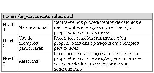 No nível 1, não relacional, não há evidências de qualquer aspecto que envolva o pensamento relacional. No nível 2, uso de exemplos particulares, há o reconhecimento de relações numéricas, de propriedades das operações e do sinal de igualdade somente nos casos apresentados. No nível 3, o relacional, as ligações estão além dos casos particulares e revelam o reconhecimento de relações numéricas, propriedades das operações e o sinal de igualdade em casos gerais.