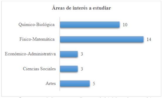 En cuanto a su elección profesional, algunas de ellas están a uno o dos años de elegir un área del conocimiento en la cual desean desempeñarse y otras tienen aún algunos años para hacerlo. El área de conocimiento más mencionada fue la Fisicomatemática siendo 14 veces elegida, la segunda más popular fue la Químico-Biológica y sorpresivamente contrario a la opinión de las padres y madres encontramos a 5 jóvenes que eligieron afies. Los datos obtenidos muestran que más de la mitad de este gmpo de jóvenes no elegiría una carrera estrechamente relacionada con Matemáticas (59%).
