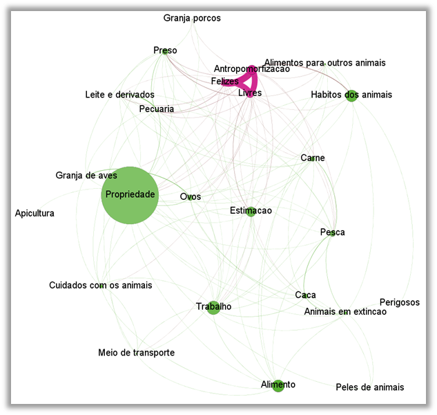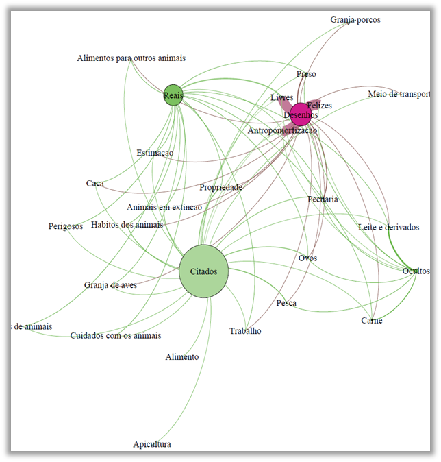 Em um outro sentido, os animais enquanto “desenho” desempenham uma função muito mais alegórica nesses livros com uma frequência notadamente maior em relação aos outros códigos, haja vista a espessura das arestas que o ligam aos nós “felizes”, “antropomorfização” e “livres”.